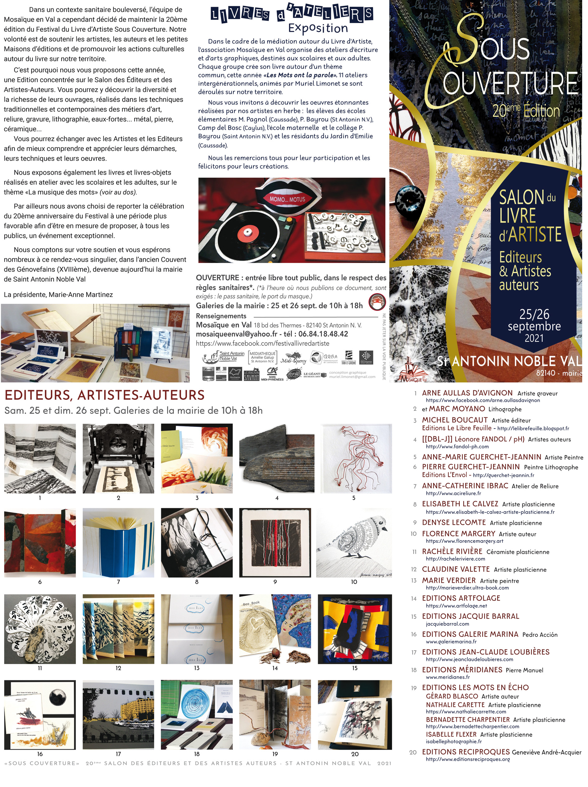 SALON du Livre d’artiste et de bibliophilie contemporaine. L’événement s’inscrit dans une longue tradition littéraire de la cité et y trouve sa place, grâce à la diversité et la richesse des ouvrages présentés. 23 éditeurs, auteurs, lithographes, graveurs, relieurs, plasticiens... vous feront entrer dans l’univers des livres rares, uniques ou multiples, réalisés dans les techniques traditionnelles et contemporaines des métiers d’art. Métal, céramique, cuir, bois,... aucune limite à l’imagination des créateurs pour mettre en lumière les mots.