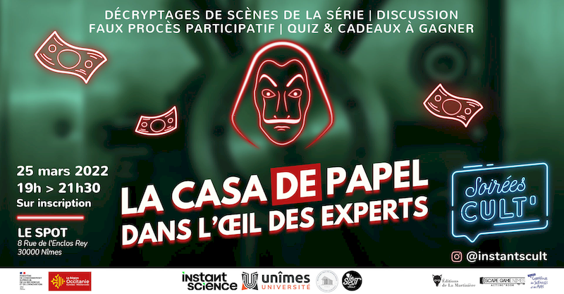 Enfilez votre plus belle combinaison rouge et préparez votre moustache à la Dali pour le casse du siècle : le 25 mars prochain, plongez dans l’univers de la série Casa de Papel au Spot à Nîmes. Au programme : un faux procès du Professeur pour découvrir le fonctionnement de la justice, une analyse psychologique de personnages phares, et un grand quiz sur la série avec des lots à la clé !