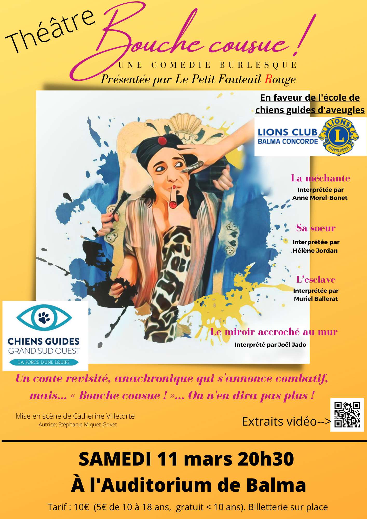 Le Petit Fauteuil Rouge en partenariat avec le Lions Club Balma Concorde présente sa création « Bouche Cousue ». Une comédie burlesque qui se joue au profit de notre Association Chiens Guides Grand Sud Ouest.