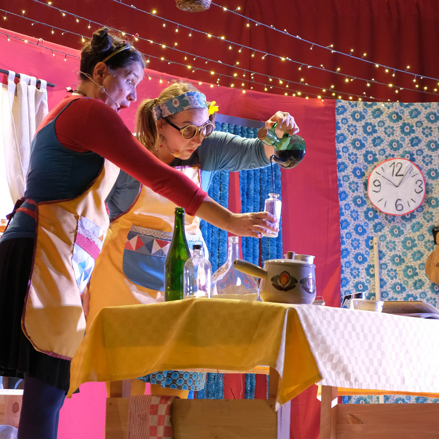 Tartine et Mirabelle embarquent le public dans une cuisine haute en couleur. Un tourbillon de sensations et de saveurs donnera vie à l’esprit de Noël, de la convivialité et bien sûr de la gourmandise Miam ! Deux cuisinières plus que farfelues qui patouillent, renversent, tambouillent dans leur cuisine faite de bric et de broc pour réaliser la recette du Croqu’Noël. Le seul, l’unique Croqu’Noël doit être parfait car il possède des vertus magiques qui transforment l’ordinaire en extraordinaire.