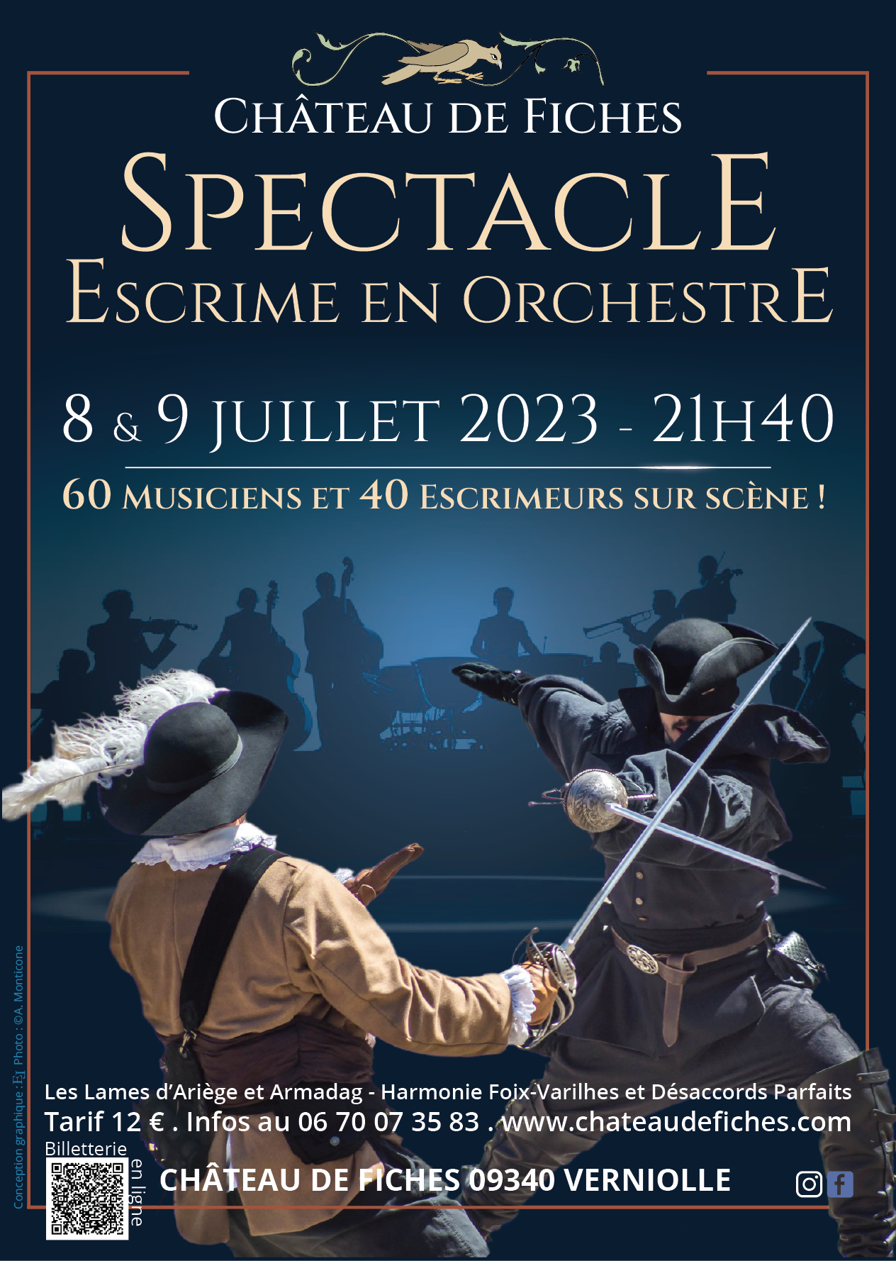 Un grand spectacle d’escrime et un voyage à travers les siècles, en musique ! Au pied du château de Fiches, vivez l’aventure des courageux Cathares, des puissants Vikings, des brillants Mousquetaires, des espiègles Pirates et bien d’autres personnages hauts en couleurs. Des combats époustouflants, des chants, des rires et de l’émotion au rythme d’un orchestre de 60 musiciens !