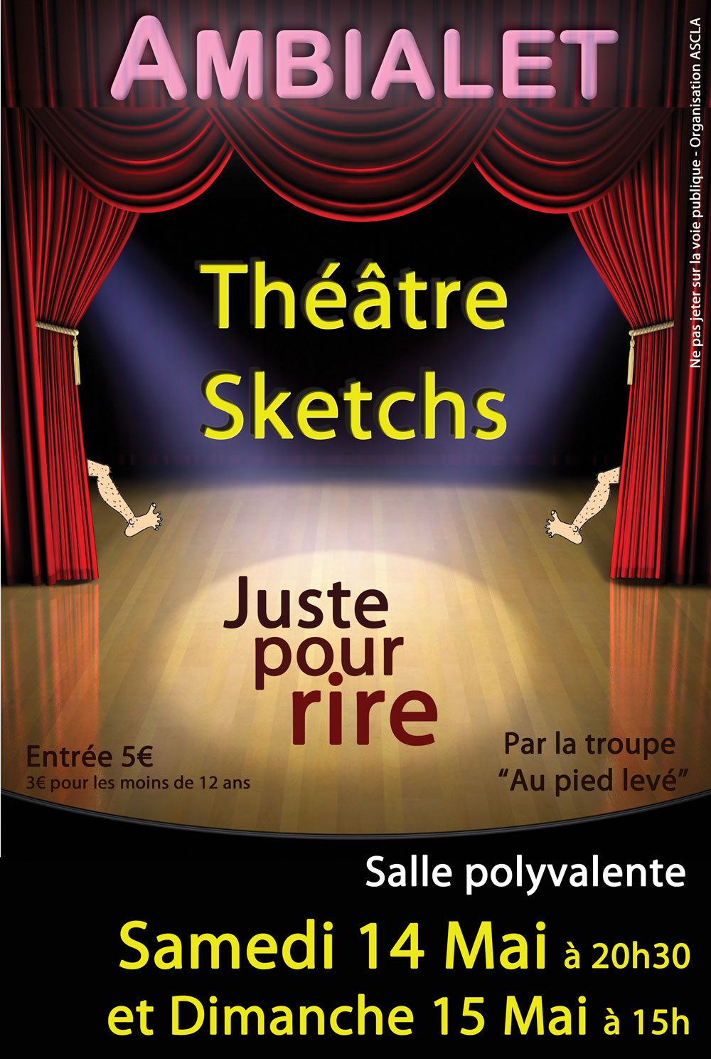 Samedi soir 14 mai à 20h30 et dimanche après-midi 15 mai à 15h à la salle polyvalente de la Condomine à Ambialet, l’ASCLA (Association Sport Culture et Loisir d’Ambialet) vous invite à assister à son spectacle humoristique de Théâtre et de Sketchs.