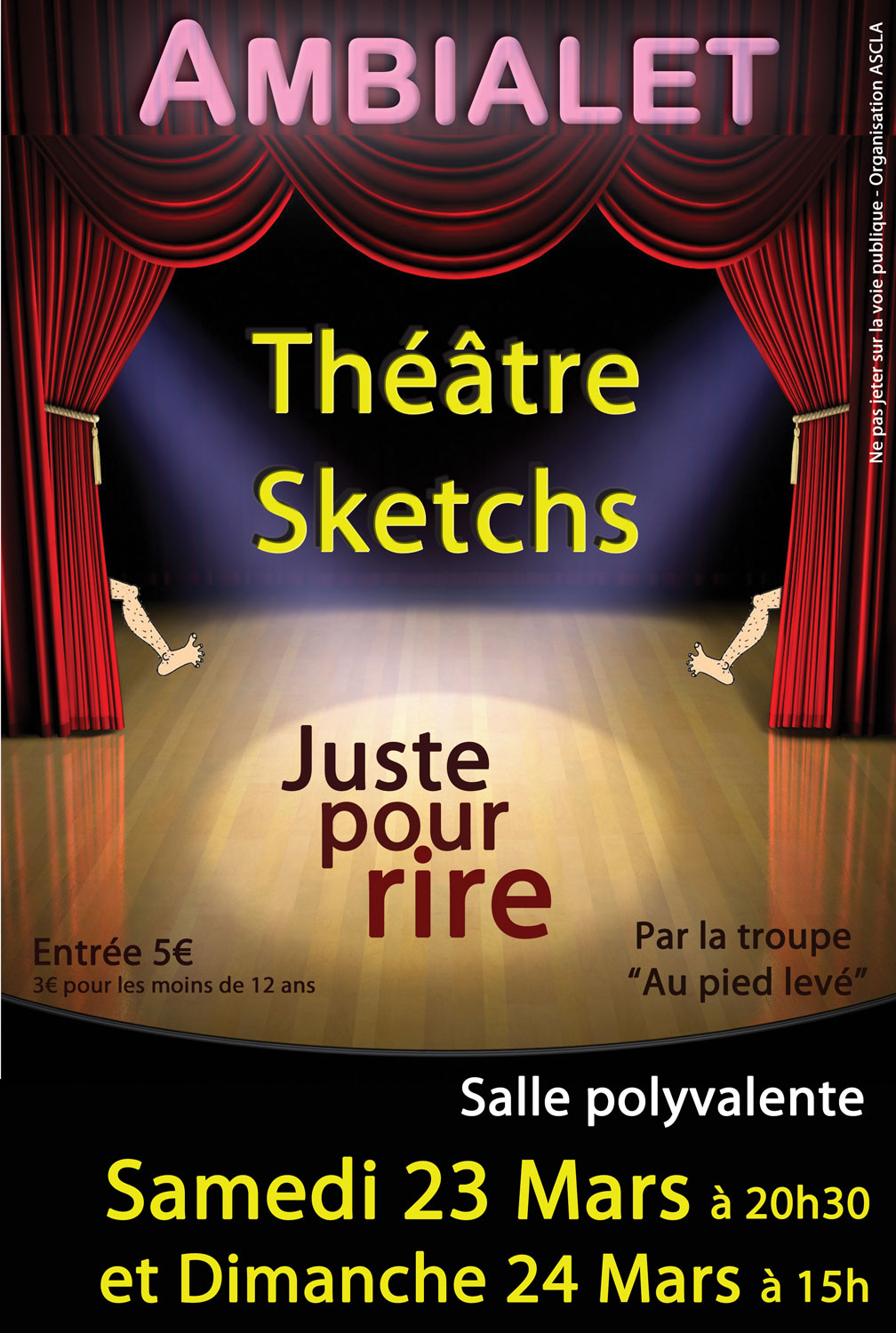 Samedi soir 23 mars à 20h30 et dimanche après-midi 24 mars à 15h à la salle polyvalente de la Condomine à Ambialet, l’ASCLA (Association Sport Culture et Loisir d’Ambialet) vous invite à assister à son spectacle humoristique de Théâtre et de Sketchs.
