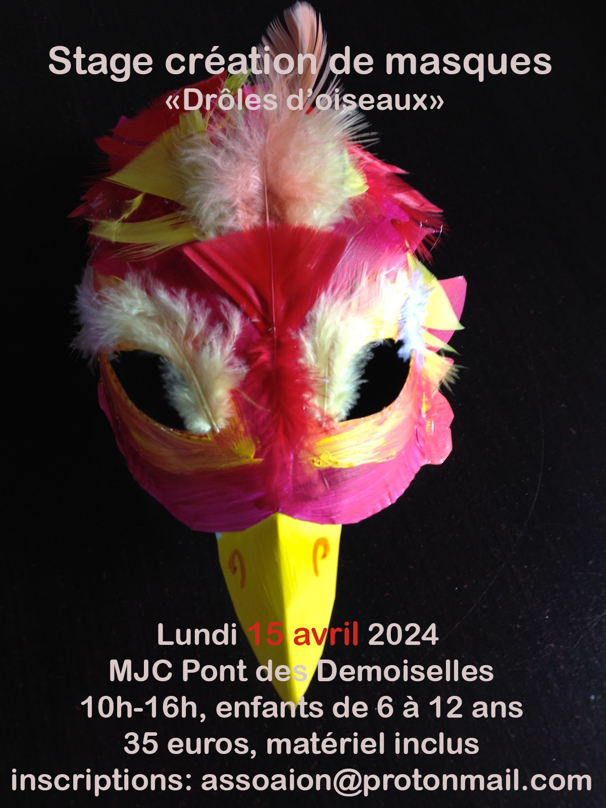 👉Pour les vacances d’avril le Collectif Aiôn propose un stage de création de masques aux enfants de 6 à 12 ans.