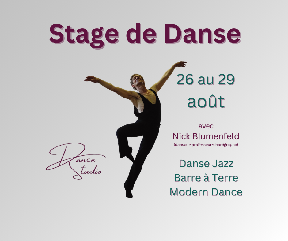 Stage de Danse du 26 au 29 août 2024 avec Nick Blumenfeld (danseur, professeur, chorégraphe) au Dance Studio à Toulouse.