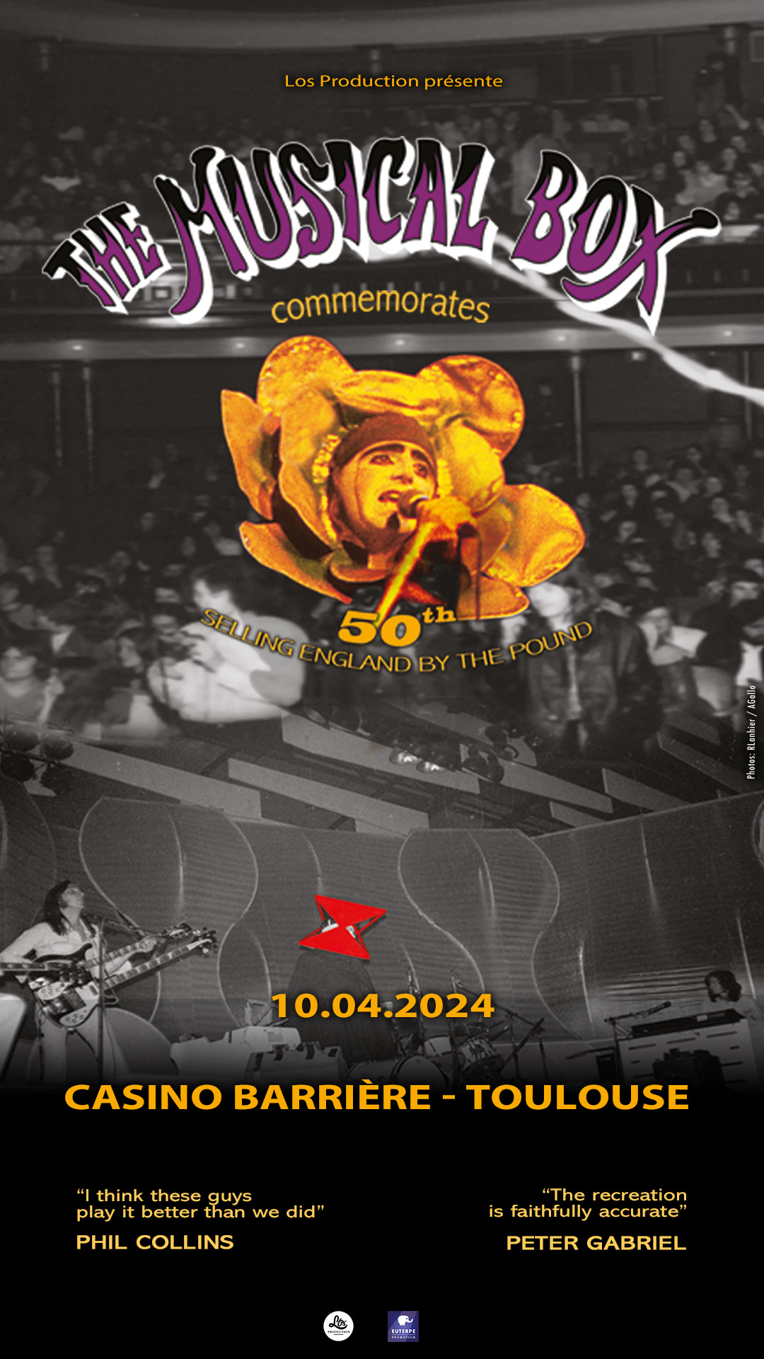 The Musical Box, qui a accueilli sur scène Phil Collins et SteveHackett et a été acclamé par plus d’un million de spectateurs dans les salles les plus prestigieuses du monde tel que Royal Albert Hall de Londres, présentera Selling England by the Pound, le concert emblématique de 1973 dans ses moindres détails.