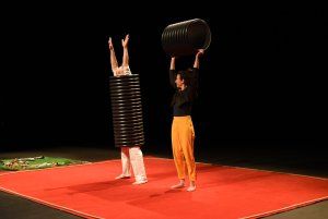Toyo c’est un tuyau de chantier tout creux... quelle aubaine ! Coline la clarinettiste le fait chanter et toutes sortes de sons semblent sortir de lui. Gillou le contorsionniste apprivoise Toyo et comme Gillou est très mais alors très souple, il se glisse à l’intérieur et s’y installe... Toyo devient pour lui une carapace, un costume, une tour d’équilibriste !