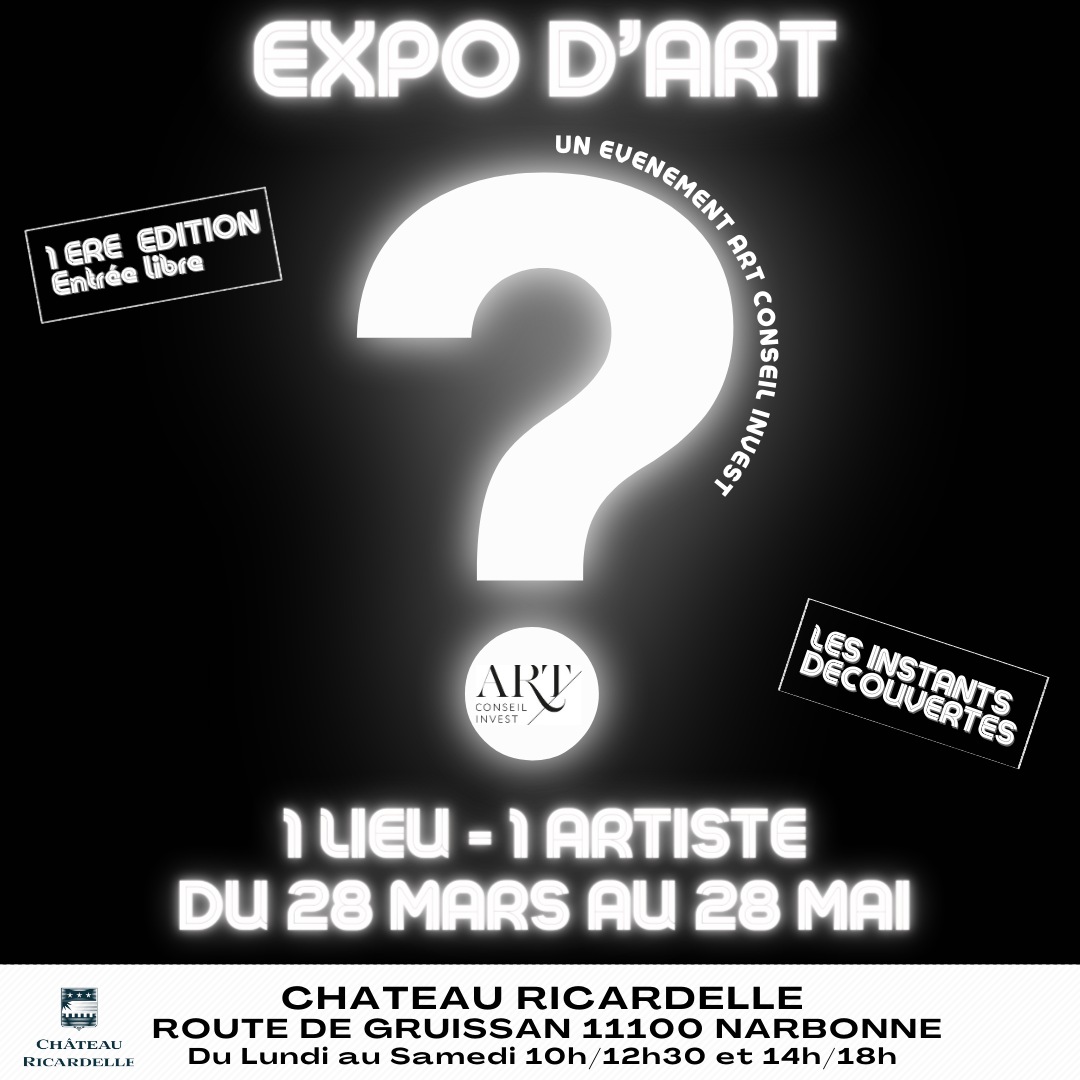 La première exposition se déroule au Château Ricardelle, Route de Gruissan 11100 Narbonne. Elle est visible du 28 mars au 28 mai du lundi au samedi de 10h à 12h30 et de 14h à 18h.