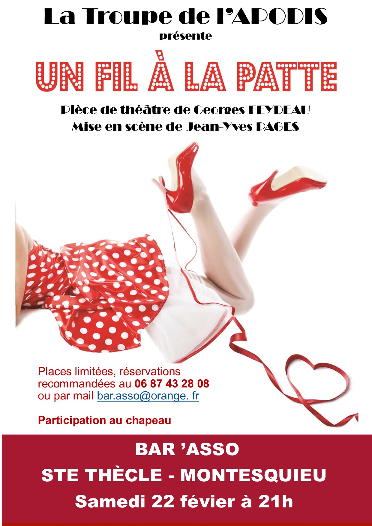 Sous la direction pétillante de Jean-Yves Pagès, la Troupe de l’Apodis revisite "Un fil à la patte" de Feydeau. Dans cette comédie d’intrigues et de quiproquos, Fernand de Bois d’Enghien tente désespérément de rompre avec sa maîtresse chanteuse le jour de ses fiançailles. Mais rien ne se passe comme prévu ! Entre portes qui claquent, mensonges maladroits et personnages hauts en couleur, préparez-vous à une soirée hilarante, portée par une mise en scène inventive et des comédiens débordants d’énergie.