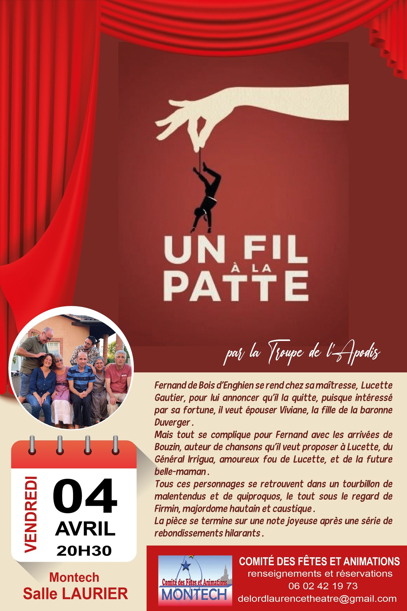 Sous la direction pétillante de Jean-Yves Pagès, la Troupe de l’Apodis de Montbeton revisite "Un fil à la patte" de Feydeau. Dans cette comédie d’intrigues et de quiproquos, Fernand de Bois d’Enghien tente désespérément de rompre avec sa maîtresse chanteuse le jour de ses fiançailles. Mais rien ne se passe comme prévu ! Entre portes qui claquent, mensonges maladroits et personnages hauts en couleur, préparez-vous à une soirée hilarante, portée par une mise en scène inventive et des comédiens débordants d’énergie.