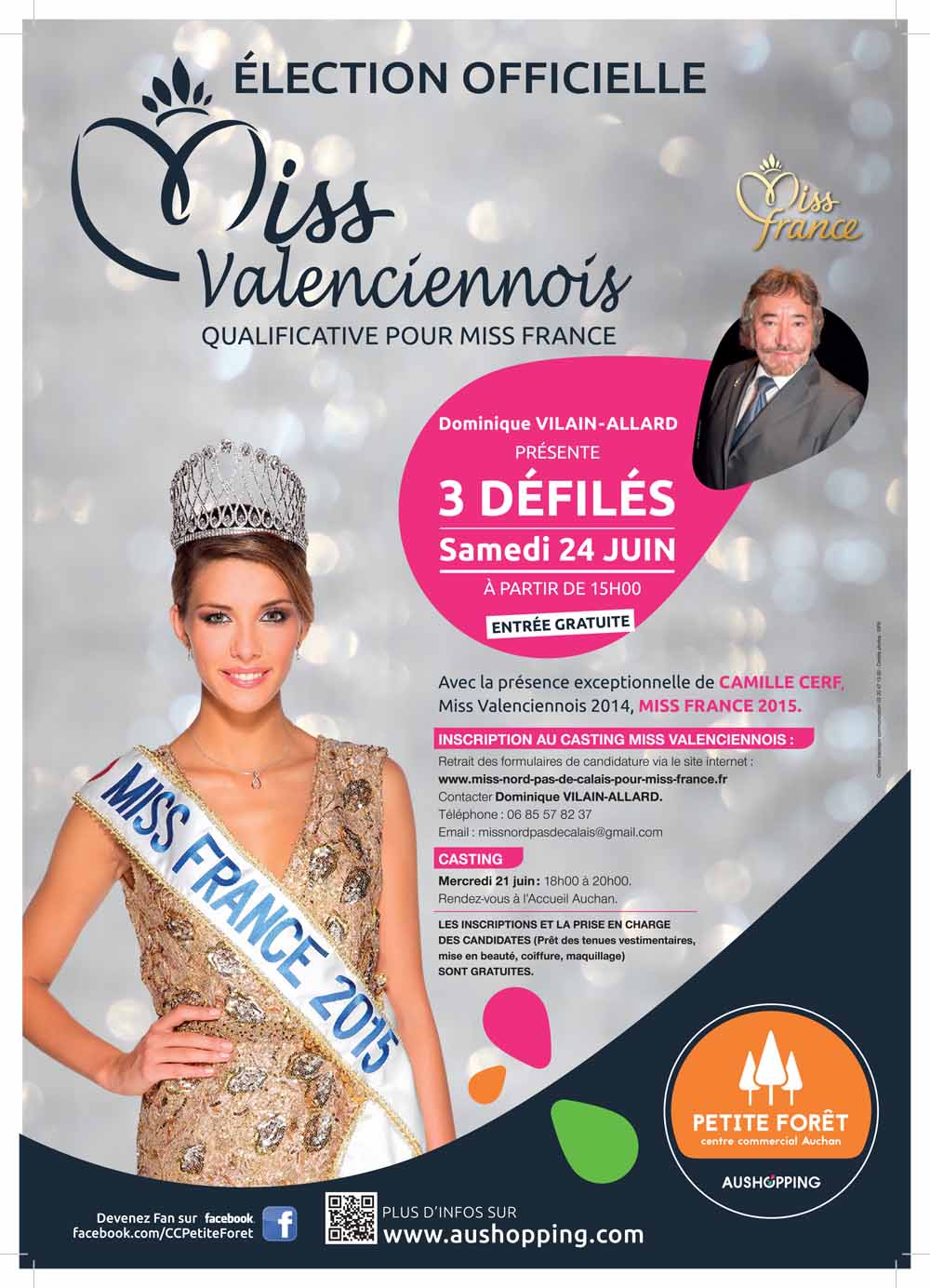 Samedi 24 Juin : à partir de 15h00 jusqu’à 18h00 : défilés des candidates, élection Miss Valenciennois et de ses dauphines, dédicaces et selfies avec Camille Cerf, Miss France 2015, en perspective ! Tous les rendez-vous auront lieu : Centre Aushopping Petite Forêt. Spectacle gratuit pour le public.