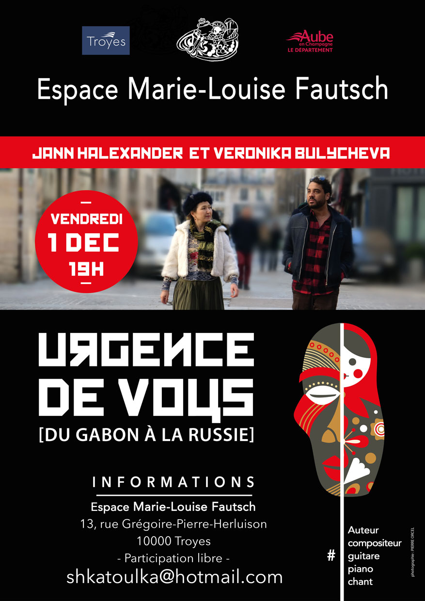 Deux artistes venus d’ailleurs : Jann Halexander natif du Gabon, Veronika Bulycheva, native de Russie. Ils se retrouvent sur scène. Les deux sont poètes, musiciens auteurs compositeurs et interprètes, chacun a son parcours original : ils présentent et mélangent leurs univers personnels à travers leurs chansons et des dialogues poignants, où la tolérance, l’humanisme, la paix, la fraternité ne sont pas des vains mots. Ce spectacle mélange poème, théâtre et chant. L’humour et la tendresse ne sont jamais loin. On se retrouve en face de polémiques actuelles autours des clichés et des préjugés liés à leurs pays d’origine : être biculturel est une fragilité et force à la fois.