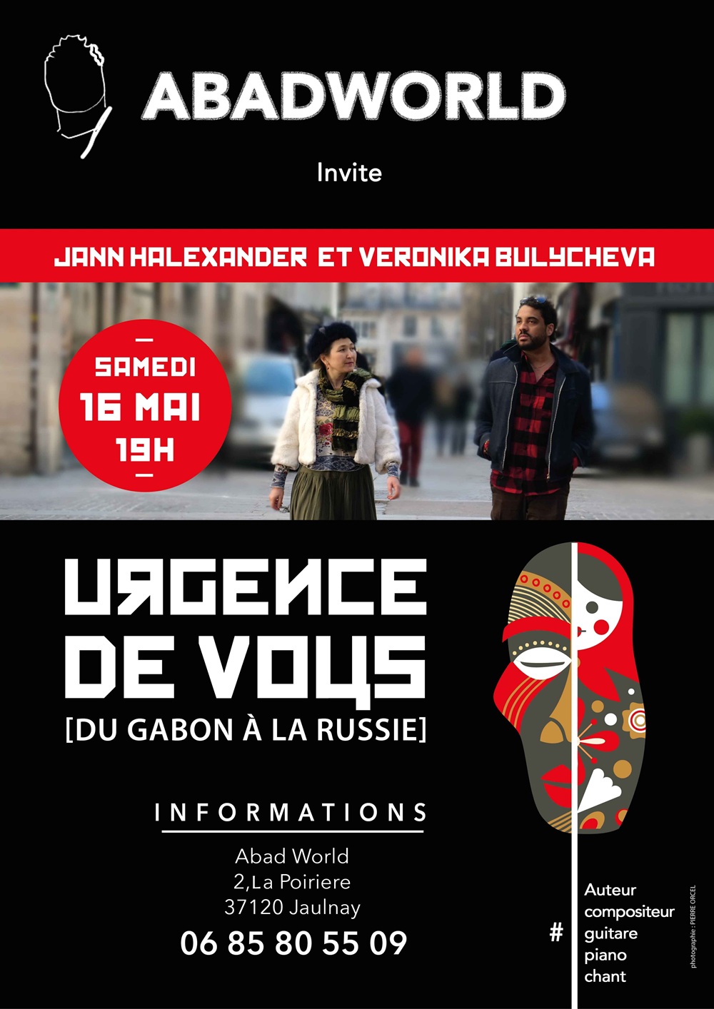 Deux artistes venus d’ailleurs : Jann Halexander natif du Gabon, Veronika Bulycheva, native de Russie. Ils se retrouvent sur scène. Les deux sont poètes, musiciens auteurs compositeurs et interprètes, chacun a son parcours original : ils présentent et mélangent leurs univers personnels à travers leurs chansons et des dialogues poignants, où la tolérance, l’humanisme, la paix, la fraternité ne sont pas des vains mots. Ce spectacle mélange poème, théâtre et chant. L’humour et la tendresse ne sont jamais loin. On se retrouve en face de polémiques actuelles autours des clichés et des préjugés liés à leurs pays d’origine : être biculturel est une fragilité et force à la fois.