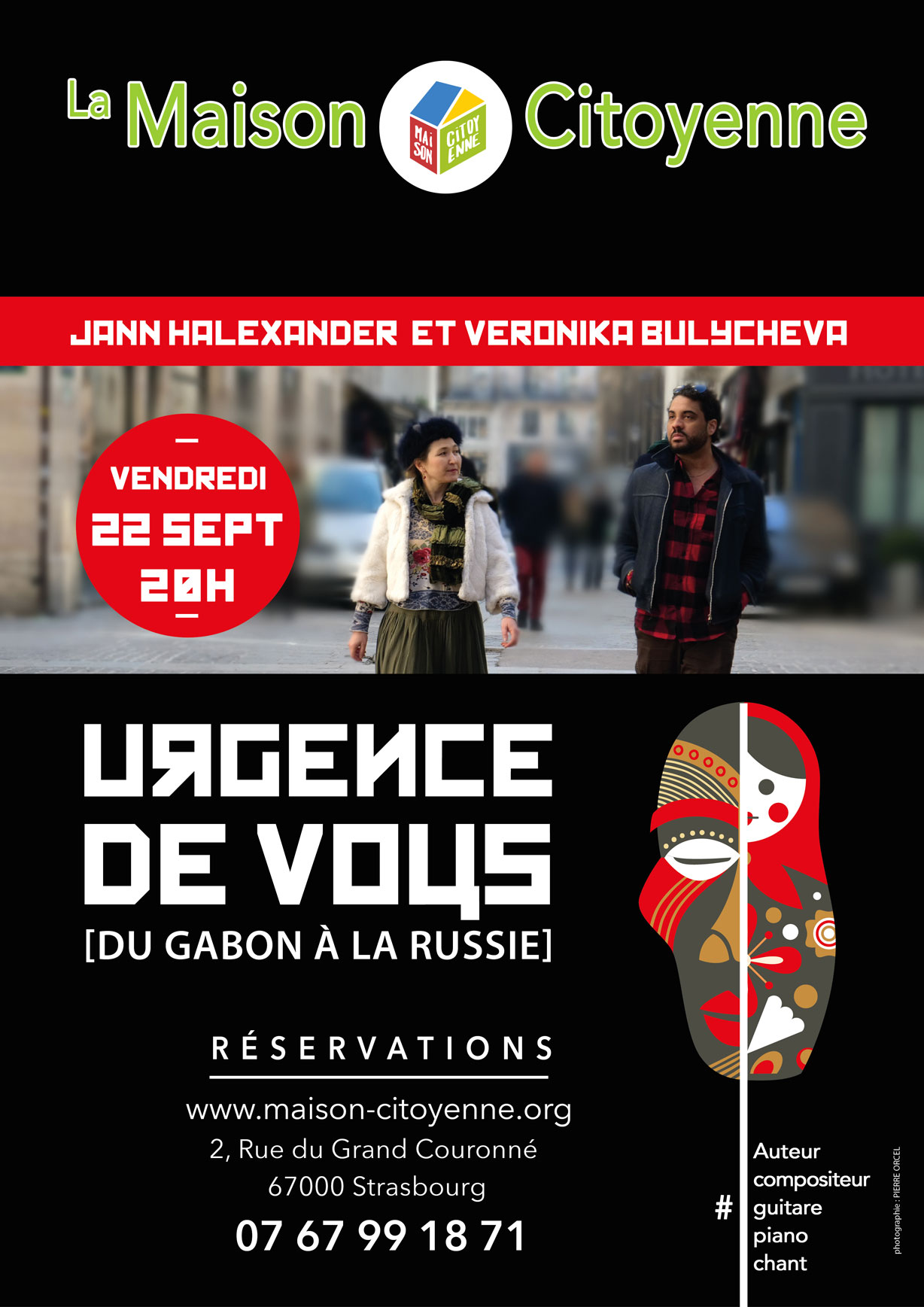Deux artistes venus d’ailleurs : Jann Halexander natif du Gabon, Veronika Bulycheva, native de Russie. Ils se retrouvent sur scène. Les deux sont poètes, musiciens auteurs compositeurs et interprètes, chacun a son parcours original : ils présentent et mélangent leurs univers personnels à travers leurs chansons et des dialogues poignants, où la tolérance, l’humanisme, la paix, la fraternité ne sont pas des vains mots. Ce spectacle mélange poème, théâtre et chant. L’humour et la tendresse ne sont jamais loin. On se retrouve en face de polémiques actuelles autours des clichés et des préjugés liés à leurs pays d’origine : être biculturel est une fragilité et force à la fois.