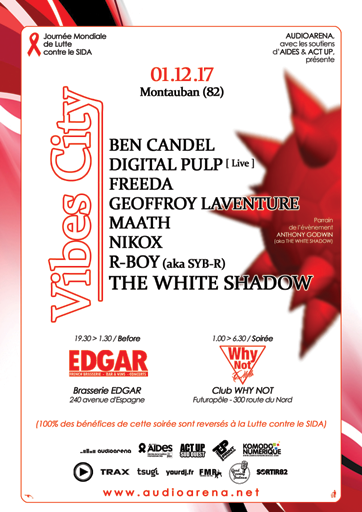 Dans le cadre de la « Journée Mondiale de Lutte contre le Sida », AUDIOARENA, avec les soutiens d’AIDES et ACT UP SO, présente un événement caricatif qui se déroulera à Montauban, le Vendredi 1 Décembre 2017, et dont les bénéfices seront reversés à la Lutte contre le Sida.