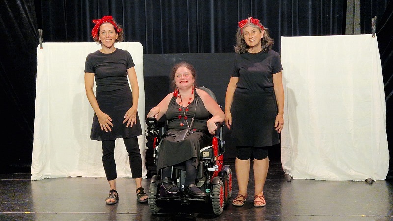 Une femme assise (jouée par Sophie Lombard, comédienne à roulettes), entourée de ses filles et compagnons (canard, escargots, papillons, cochons…), regarde le monde : une bande dessinée des années 70.