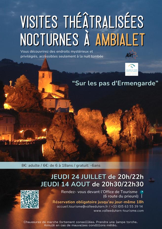 Sous la houlette d’un singulier personnage, arpentez les ruelles tortueuses de la ville basse et plongez dans le passé d’Ambialet, ancien fief des vicomtes Trencavel. Vous découvrirez alors des endroits mystérieux et privilégiés, accessibles seulement à la nuit tombée : les abords de l’église Saint-Gilles du XIe siècle, surplombant la rivière et ceux du barrage, vus sous un autre angle.