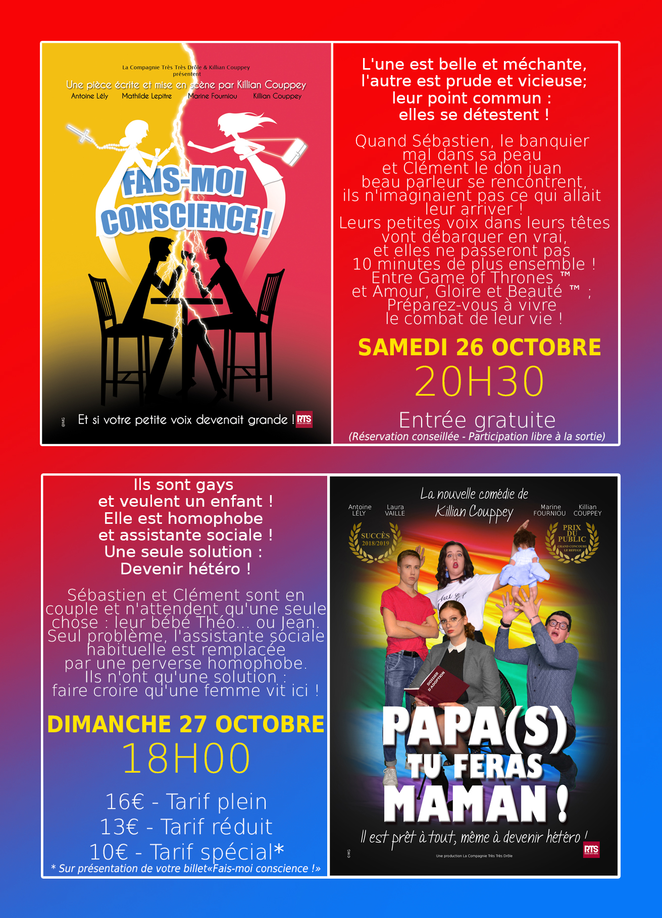 A l’occasion de la sortie de sa nouvelle comédie, la Compagnie Très Très Drôle vous propose ses deux spectacles : "Fais-moi conscience !" et "Papa(s) tu feras Maman !"