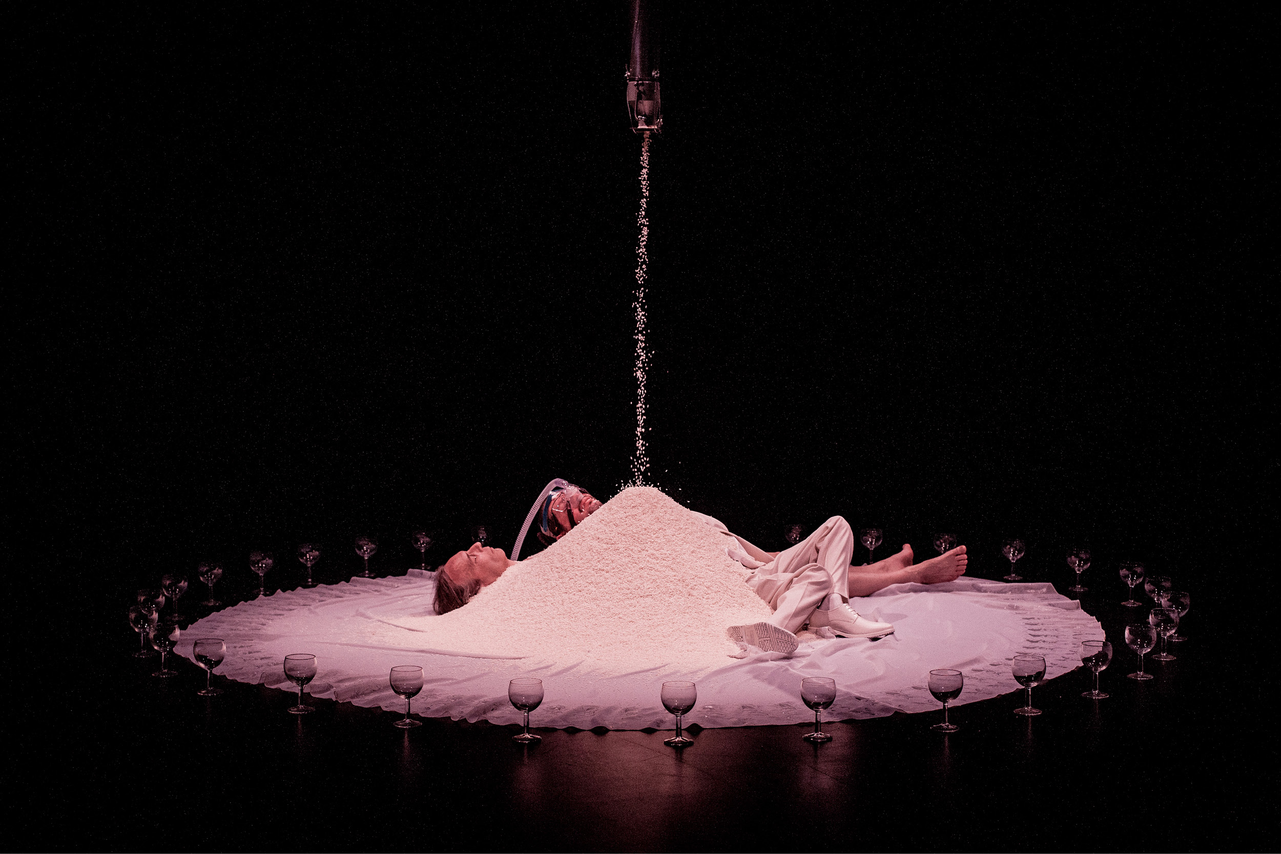 L’œuvre issue de leur collaboration évoque la célébration d’un mariage étrange et improbable ; les noces de deux corps immobiles dans une sorte de rituel poétique que les artistes partagent avec le public.