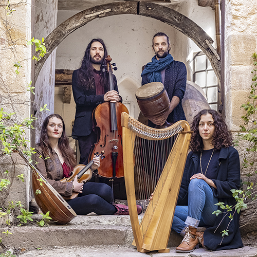 Christophe Montet (Daf, Tombak), Théophi le JOUBERT (Violoncelle, baglama, oud, chant), Mona HILALY (Harpe, mandoline d’octave, oud, chant), Aelis LODDO (Violon, alto, chant)