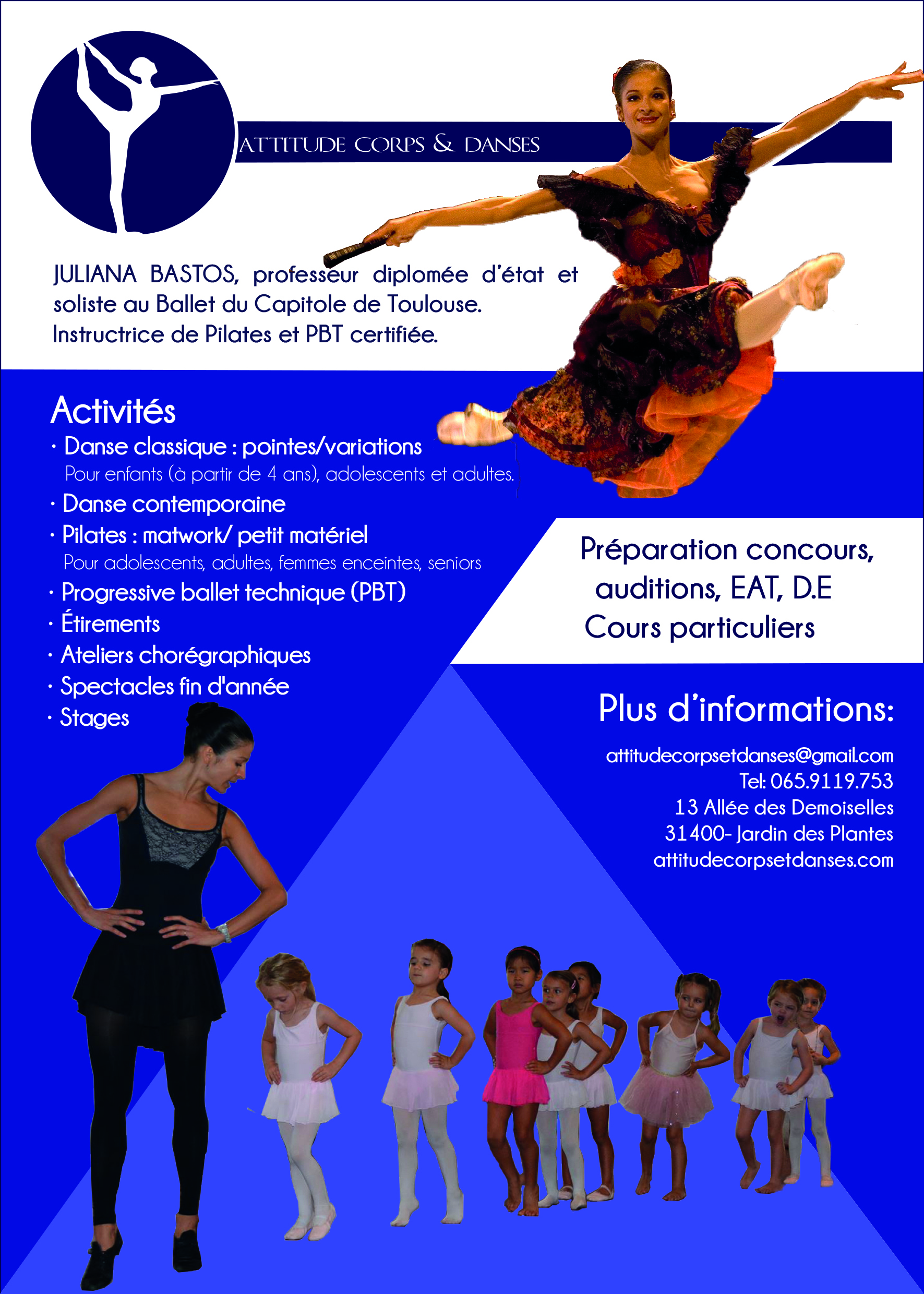 Attitude Corps & Danses est une association loi 1901 que propose des cours de danses (classique et contemporain), des stages, des ateliers, du pilates et du PBT destiné aux enfants, aux adolescents et aux adultes (amateurs/professionnels et tous niveaux). Fondé en 2016 à Toulouse de la volonté de créer un espace dédié à l’apprentissage de la danse, à la création chorégraphique, au spectacle vivant et au bien-être.
