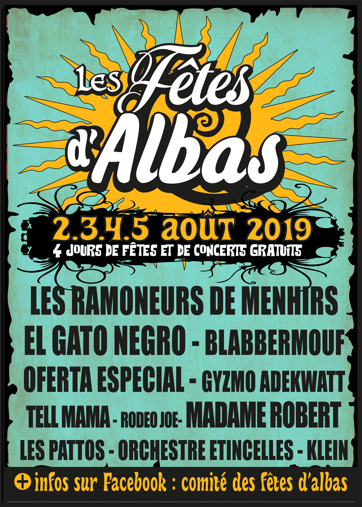 Cette année verra le retour à Albas des RAMONEURS DE MENHIRS. Ils seront accompagnés par le groupe madrilène OFERTA ESPECIAL, le rappeur néerlandais BLABBERMOUF et GYZMO ADEKWATT pour clôturer la soirée.