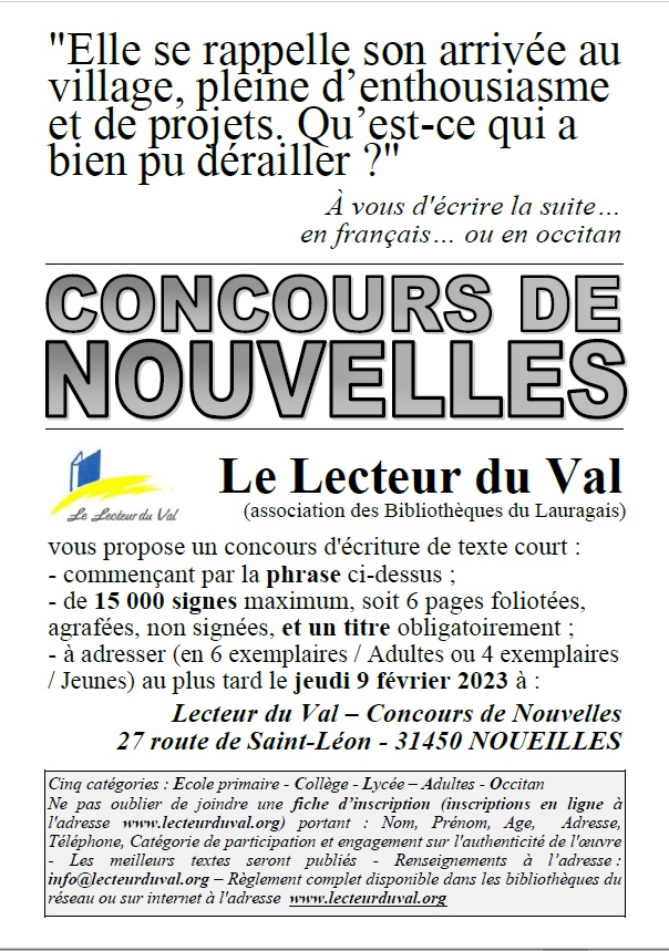 Le Lecteur du Val (association de bibliothèques du Lauragais) propose pour la 25e année consécutive un concours de nouvelles ouvert tous, enfants, jeunes et adultes. Il s’agit d’écrire un texte court (6 pages/15 000 signes maxi) commençant par une phrase donnée.