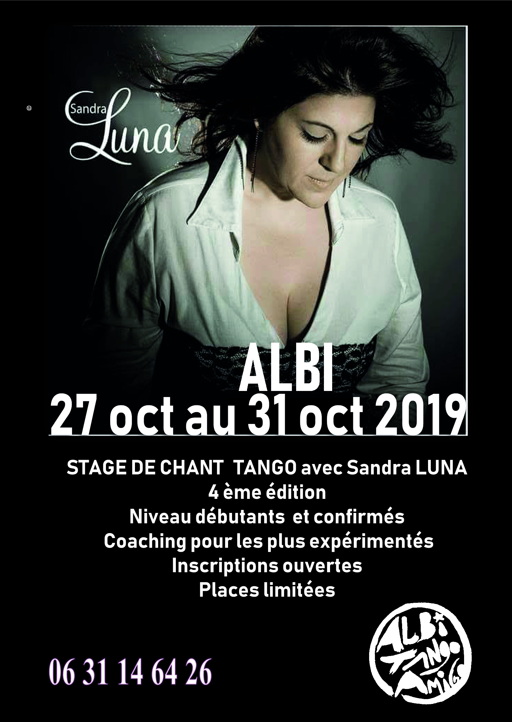 Se familiariser ou se perfectionner en tango chanté : un répertoire intense, exigeant et plein de subtilités qui devrait intéresser les chanteurs curieux ! Sandra lUNA est une grande chanteuse argentine, une personnalité reconnue dans le monde artistique protègne (Buenos Aires) : elle chante depuis l’âge de 5 ans et a connu trés jeune déjà le succés (scène, TV. ;) elle a fréquenté de trés grands musiciens, compositeurs et chanteurs de cette époque aujourd’hui disparus ! grande pédagogue, elle sait se mettre à la portée de chacun pour l’amener plus loin et toucher le coeur avant de s’attacher à la voix et à l’interprétation du tango... ,, elle propose un séminaire en deux parties :une partie découverte et entrainement, et une partie "coaching" pour des chanteurs de tango déjà aguerris. Inscriptions avant le 15 septembre..