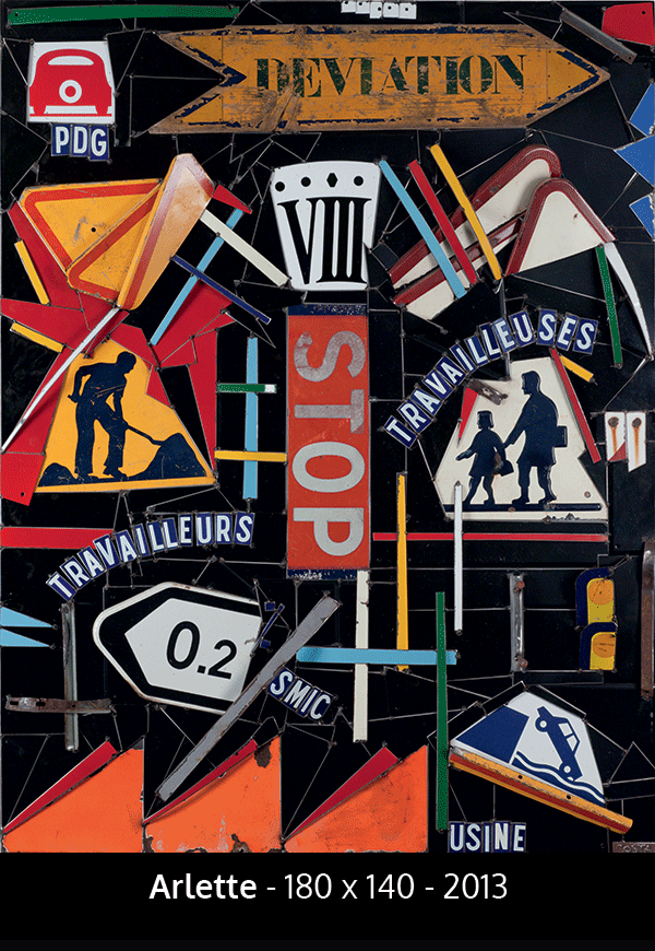 Autodidacte, F. COsta taille en pièces la signalisation routière... Un art brut aux finitions polies, qui laisse une large place à la spontanéité.Le parti pris contre le gaspillage est déterminé par le choix d’une matière première récupérée parmi les rebuts de l’Etat...
